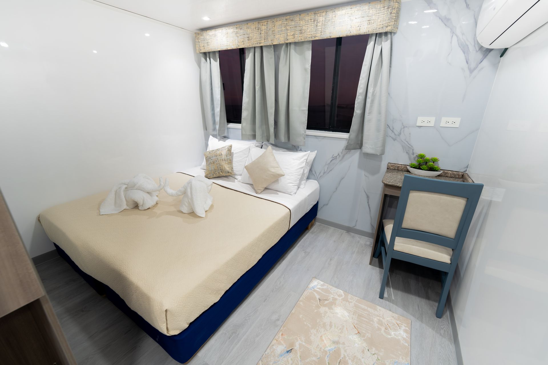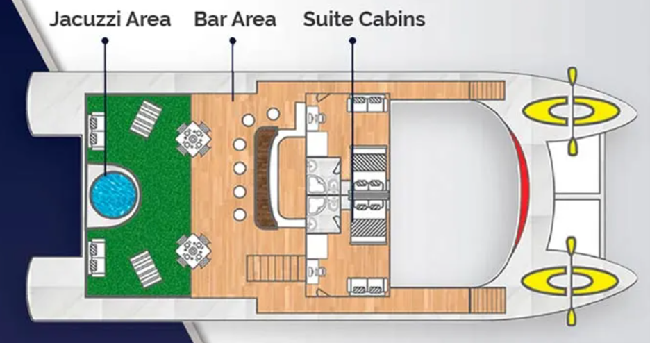 The Upper Deck features One spacious suite cabins offering panoramic ocean views, as well as the bridge, where navigation operations take place. This deck also includes a relaxation area with a jacuzzi and comfortable seating, the perfect spot to unwind while admiring the stunning scenery of the Galapagos Islands.