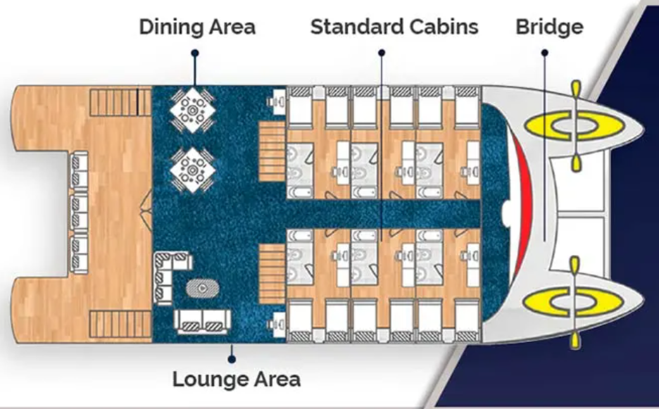 The Main Deck hosts six comfortable cabins, a welcoming dining area with a coffee station, a spacious lounge, and a boutique briefing area designed for daily excursions and briefings.